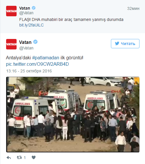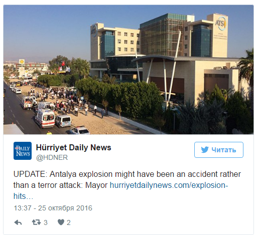 Мэр Антальи Мендерес Тюрель заявил, что пострадали от 10 до 12 человек. По словам чиновника, инцидент произошел на безлюдной парковке.