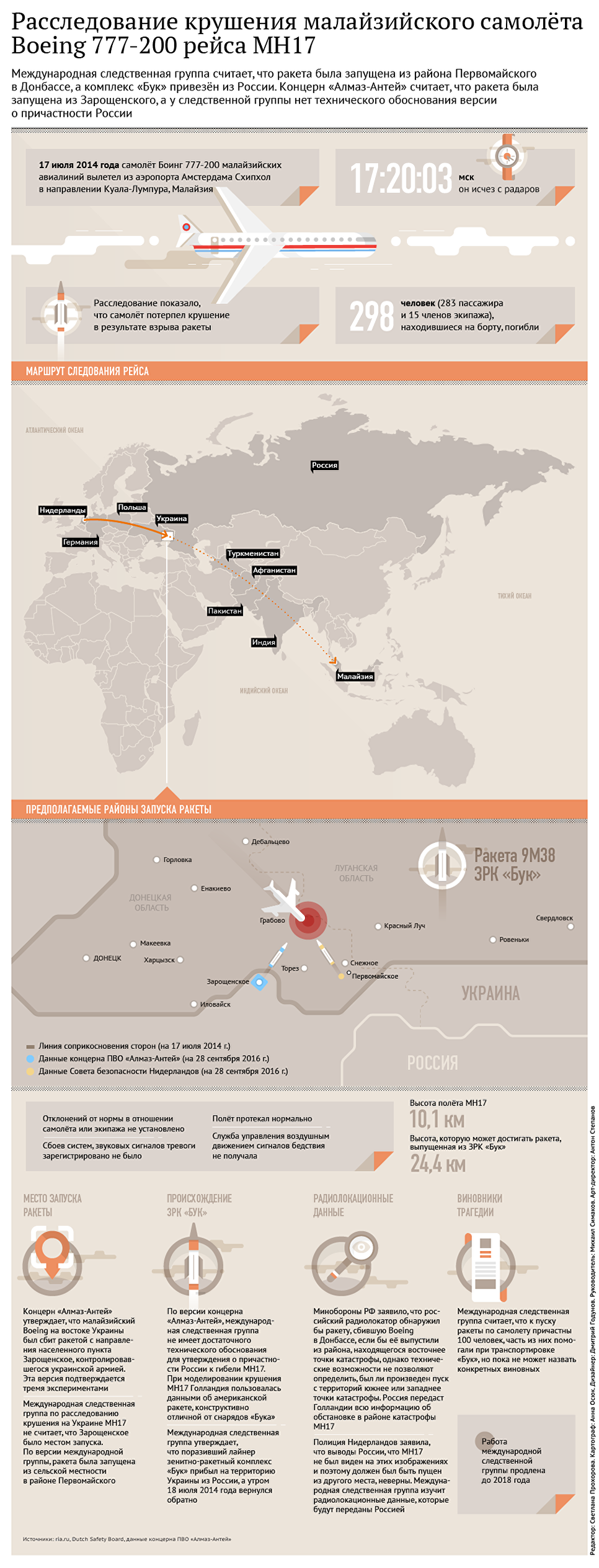 Совместная следственная группа представила 28 сентября предварительный доклад. В нем утверждается, что поразивший Boeing ЗРК "Бук" был доставлен из России, а потом возвращен обратно. В МИД России заявили о предвзятости следствия, выводы которого основаны только на данных, полученных от Украины. Эксперименты концерна "Алмаз-Антей" также подтверждают, что Boeing был сбит с территории, контролировавшейся украинской армией.