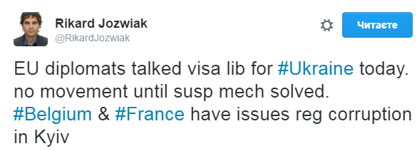 «Европейские дипломаты говорили сегодня о визовой либерализации для Украины. Никакого движения до тех пор, пока предохранительный механизм не будет разработан. У Бельгии и Франции возникли проблемы с вопросом по коррупции в Киеве», — говорится в тексте.