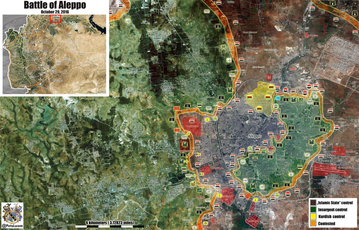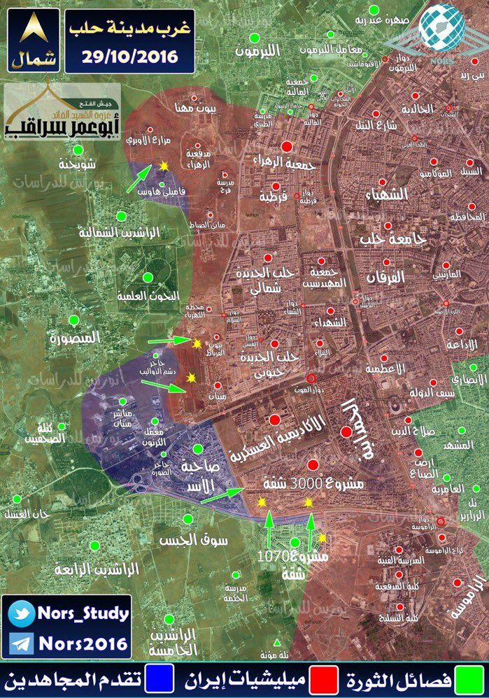 29 октября события развивались в более позиционном ключе, нежели 28 октября. Конгломерат группировок боевиков смог вторгнуться в жилую застройку в квартале Аль-Ассад и темп наступления просел буквально за день. Сегодня уже боевики оказались в роли обороняющихся в захваченном вчера квартале, который подвергается массированным артиллерийским обстрелам и авиаударам, а в западном части квартала идут бои между штурмовыми группами боевиков и атакующими силами САА, которые пытаются потеснить боевиков к западной части квартала. В бои в таком ключе достаточно удобны для САА, так как ударные силы боевиков оказываются связанными в малоосмысленных боях за развалины в западном Алеппо, которые не приближают их решению поставленных задач, зато дают возможность повторить ситуацию с Рамусехом, бои за который обескровили группировку боевиков пытавшуюся деблокировать город с юго-запада.