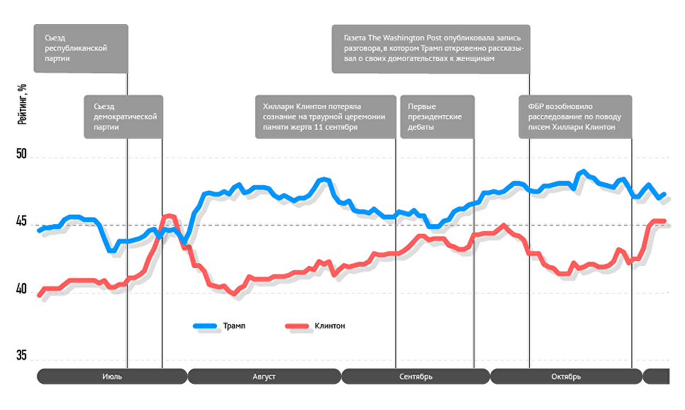 По состоянию на воскресенье, опросы по-прежнему свидетельствуют о преимуществе Клинтон. По данным RealClearPolitics, усредненный показатель дает Клинтон преимущество в 2,2 процентных пункта.