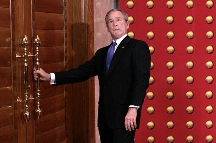 Вот только там, где, по его мнению, должна была находиться заветная и спасительная от журналистов дверь, ее не оказалось. Только после нескольких неудачных попыток открыть дверь, Буш понял, что ошибся дверью. Благодаря подсказкам окружающих, все же Джордж нашел выход и был таков.