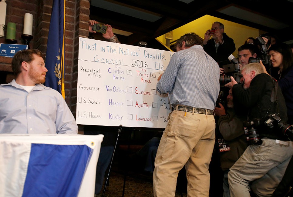 Жители Диксвилл-Нотч проголосовали в 00.01 (08.01 мск). Победителем стала кандидат от демократов Хиллари Клинтон, за которую отдали свои голоса четыре человека. Республиканец Дональд Трамп получил два голоса.