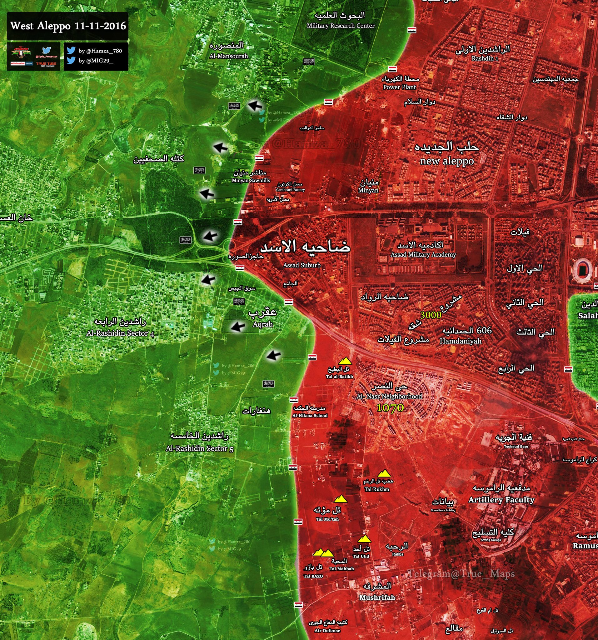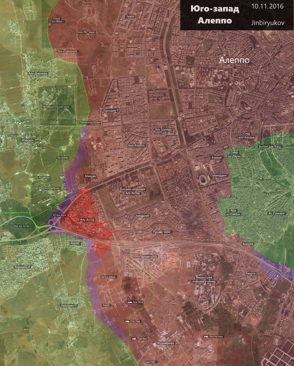 В ночь на 12 ноября, Сирийская армия и ее союзники взяли под контроль западный пригород Алеппо — район Аль-Асад после захвата Миньяна и ожесточенных столкновений с вооруженными группами боевиков. Кроме того армейцам удалось захватить картонную фабрику и фармакологический завод. Позиции банд подверглись тяжелым бомбардировкам авиацией, артиллерией и реактивными системами залпового огня.
