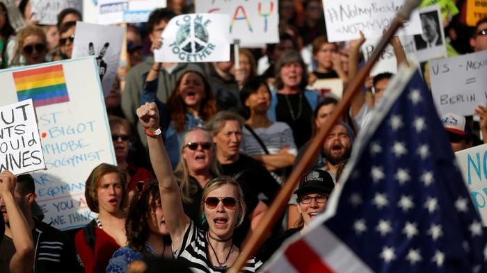В субботу тысячи человек по всей территории США приняли участие в демонстрациях против избрания Дональда Трампа президентом страны. Протестующие обвиняют республиканца в сексизме, неуплате налогов, а также в нетерпимости. При этом в штате Индиана в ходе акции протеста манифестанты забросали полицейских камнями, ранив двух стражей порядка. Очевидцы публикуют в социальных сетях фото и видео с места событий.