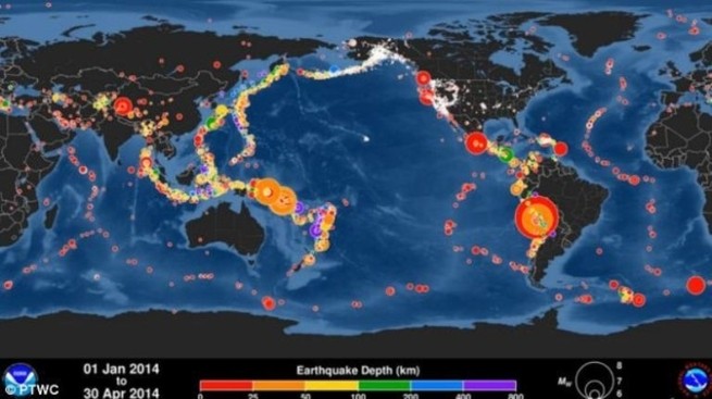 Специалисты также соблюли и хронологию событий - подземные толчки отражаются в реальной последовательности с помощью разноцветных вспышек, от которых расходятся в стороны круги.