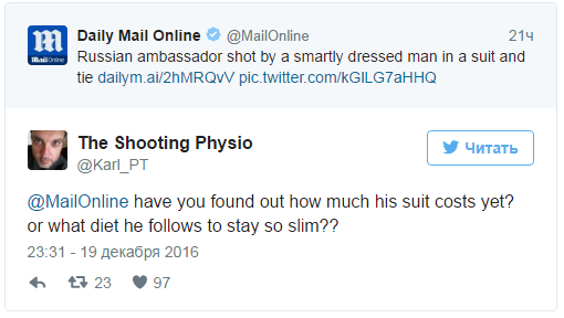 Пользователи социальных сетей раскритиковали британскую The Daily Mail за твит о "стильно одетом" убийце российского посла в Турции Андрея Карлова.