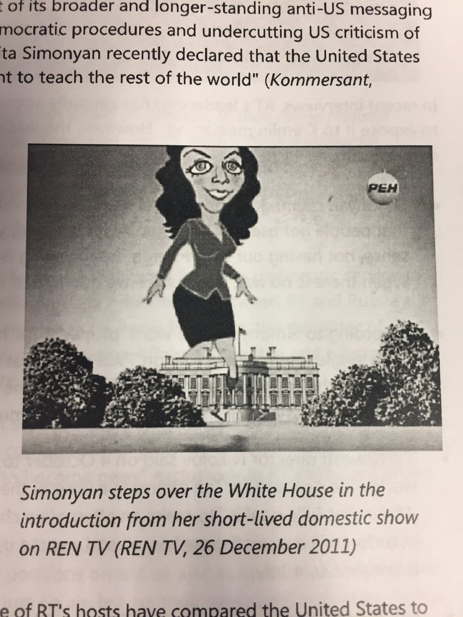 В частности, в докладе о «влиянии России» фигурирует рисунок, изображающий главного редактора агентства Sputnik и телеканала RT Маргариту Симоньян, перешагивающую через здание американского Белого дома. Как написала сама журналистка в Twitter, это кадр из заставки телешоу, которое она вела в 2011 году.