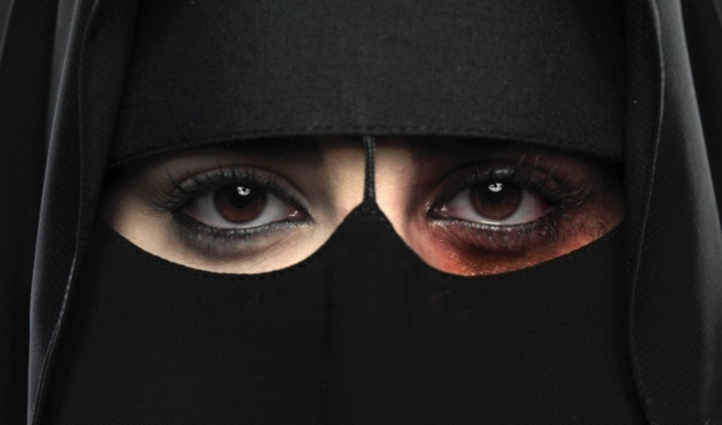 Молодая девушка в никабе, в некоторых регионах страны закрытие лица чёрной вуалью является обязательным