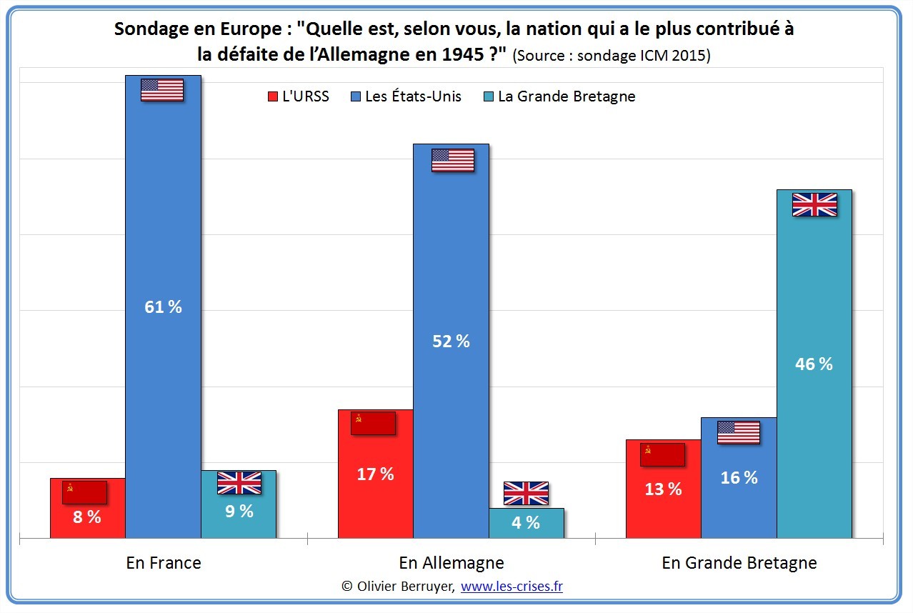 Французский блог www.les-crises.fr собрал результаты опросов французов по теме "Кто внёс наибольший вклад в победу над нацистской Германией: СССР, США или ВБ", проводившихся "французским ВЦИОМом" в 1945, 1994, 2004 и 2015.