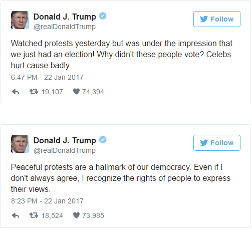 "Наблюдал за вчерашними протестами, но все время думал о том, что у нас только что прошли выборы! Почему эти люди не голосовали? Знаменитости лишь усугубляют ситуацию", - написал Трамп на своей официальной странице в сети микробиологов Twitter. Президент США при этом добавил: "Мирные протесты являются принципиальной особенностью нашей демократии. Пусть я и не всегда согласен (с протестующими, - прим. ТАСС), я признаю право людей выражать свое мнение".