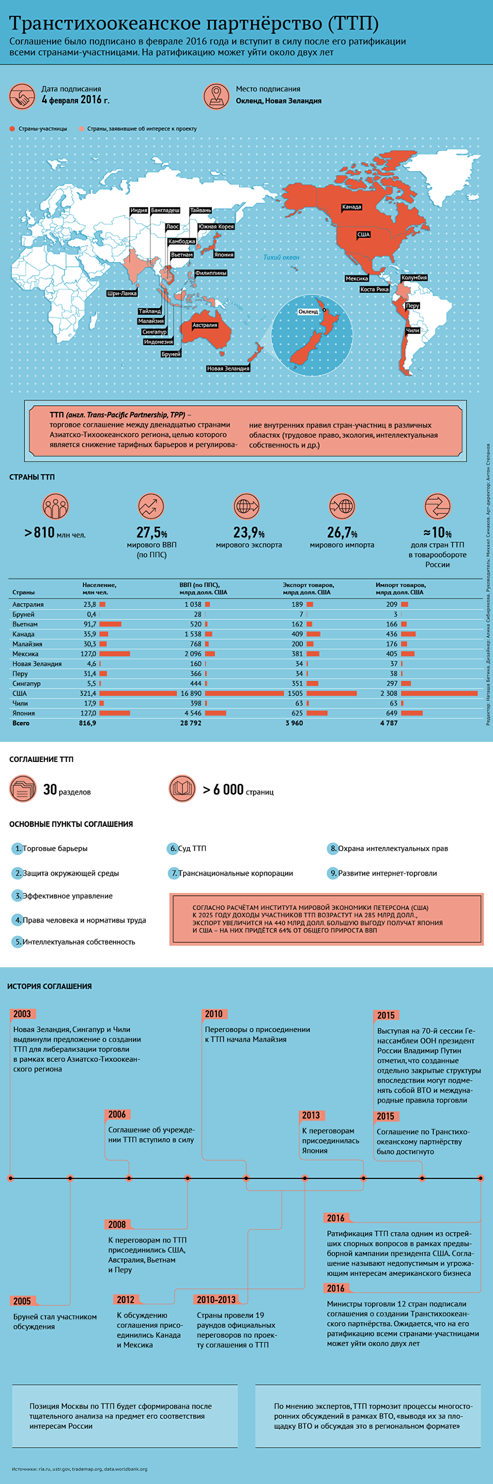 Соглашение о Транстихоокеанском партнерстве, готовившееся под руководством США в течение нескольких лет, было подписано в феврале прошлого года представителями 12 стран и подразумевало создание широкой зоны свободной торговли в Азиатско-Тихоокеанском регионе.