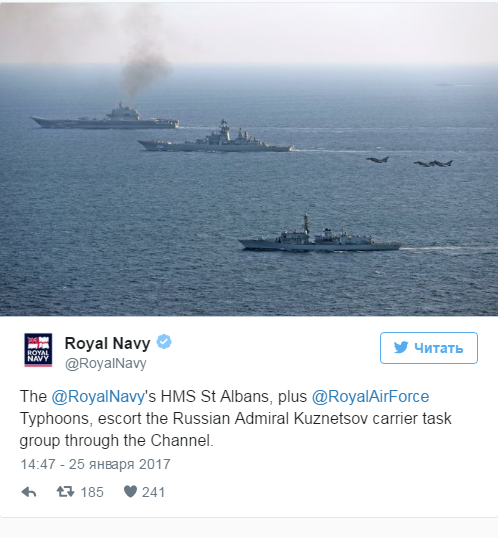 Он также добавил, что ВМФ Британии следят за «каждым шагом» корабельной группы во главе с тяжелым авианесущим крейсером «Адмирал Кузнецов», чтобы обеспечить безопасность своей страны.