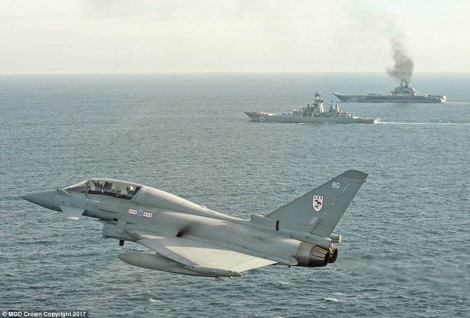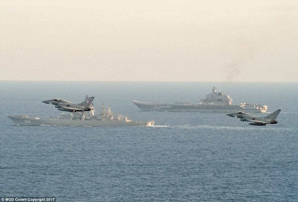 Министерство обороны Великобритании также опубликовало кадры с воздуха, на которых запечатлено сопровождение «Кузнецова» в Ла-Манше британскими истребителями.