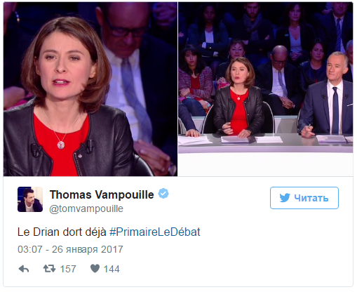 Кадр с прямой трансляции дебатов, где изображен Ле Дриан, сидящий в первом ряду перед трибуной, на которой стоят кандидаты в президенты — экс-премьер Мануэль Вальс и бывший министр образования Бенуа Амон, разместил в своем блоге в Twitter политический журналист Тома Вампуй. Голова министра опущена вниз, сжатые руки лежат на коленях. При этом взгляды всех, кто сидел рядом с ним, были прикованы к ведущим полемику кандидатам.