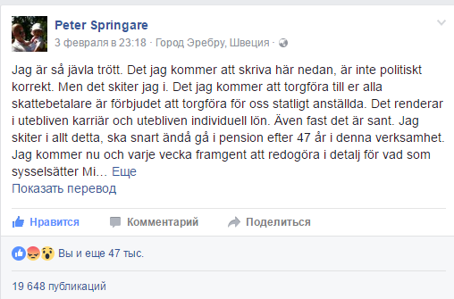 "Я чертовски устал. То, что я напишу здесь ниже - это не политкорректно. Но мне плевать. Мне плевать на все это, все равно скоро на пенсию после 47 лет этой деятельности.Наши пенсионеры - на коленях, в школах бардак, здравоохранение - ад, полиция связана по рукам и ногам и т.д. и т.п.Мы все знаем, почему, но никто не осмеливается или не хочет говорить о причинах.