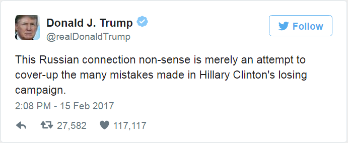 «Вздорные заявления о связях с Россией — это лишь попытка прикрыть многочисленные ошибки, сделанные во время проигрышной кампании Хиллари Клинтон», — написал Трамп на своей личной странице в Twitter.