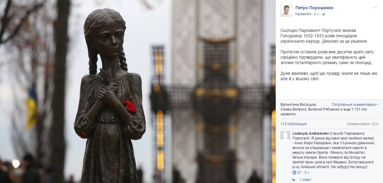 Президент Украины Петр Порошенко сообщил, что парламент Португалии признал голодомор геноцидом украинского народа. Об этом он написал в Facebook.