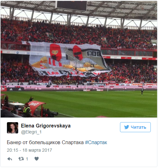 После этого на трибунах развернули другой плакат, показывающий истинных футбольных болельщиков. На нем изображены деятели искусства и политики, симпатизирующие "Спартаку", среди них — глава МИД России Сергей Лавров, пианист Денис Мацуев, народный артист РФ Дмитрий Назаров и другие. Надпись на втором баннере гласит "Добро пожаловать в Россию". При этом аббревиатуру "Би-би-си" на этот раз расшифровали как "Болельщики большой страны".