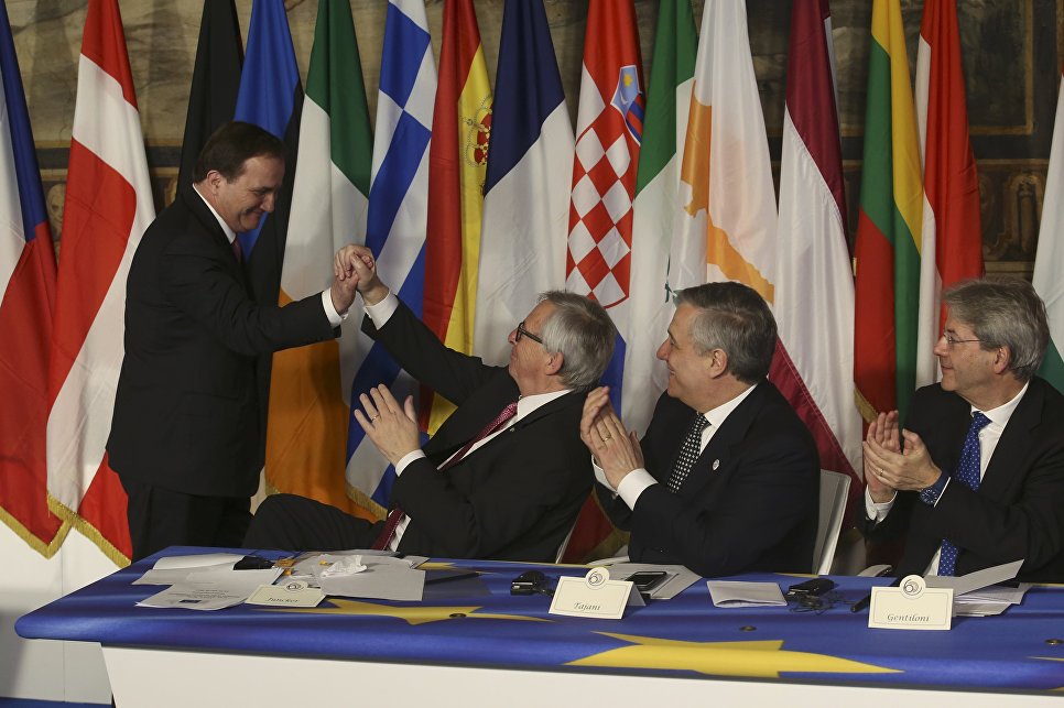 Премьер-министр Швеции Челль Стефен Левен поздравляет главу Еврокомиссии Жан-Клода Юнкера, президента Европарламента Антонио Таяни и премьер-министра Италии Паоло Джентилони с подписанием новой Римской декларации на саммите в честь 60-летия Евросоюза 25 марта 2017 года