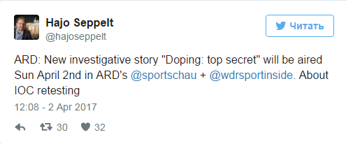 Немецкий телеканал ARD выпустит в эфир новый фильм-расследование о применении запрещённых препаратов в профессиональном спорте 2 апреля. Об этом сообщает журналист и автор цикла фильмов о допинге Хайо Зеппельт на своей странице в Twitter.