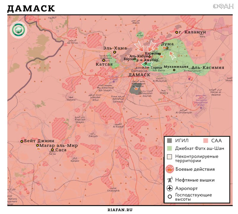 Военнослужащие Сирийской арабской армии (САА) в рамках операции по освобождению Дамаска и его окрестностей от боевиков исламистских формирований продолжают атаковать террористов в районе Барза, частично занятом вооруженной оппозицией. Правительственные подразделения нанесли серию ракетных ударов по позициям исламистов, уничтожив часть их оборонительных укреплений. Кроме того, как минимум три боевика были нейтрализованы. Вооруженные группировки оккупировали территории на восточной окраине столицы — в районах Джобар, Аль-Кабун и Барза. Главный же их форпост в этом регионе находится на территории оазиса Восточная Гута, который располагается дальше на северо-востоке от города.