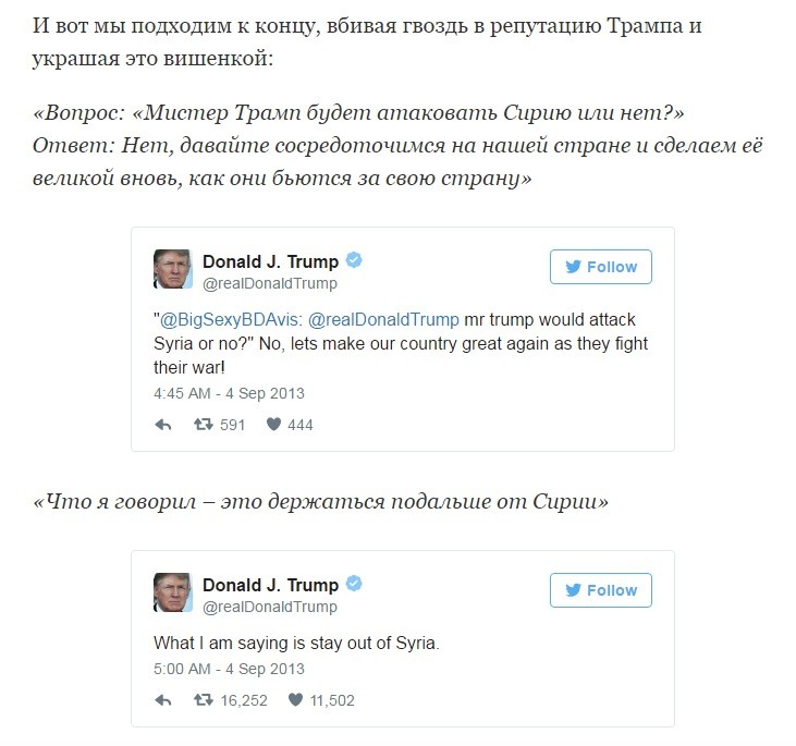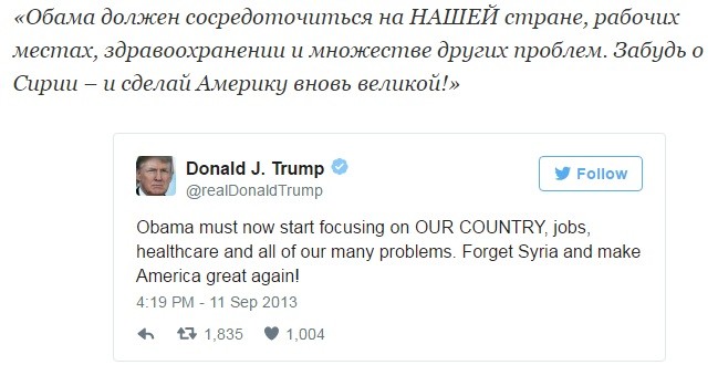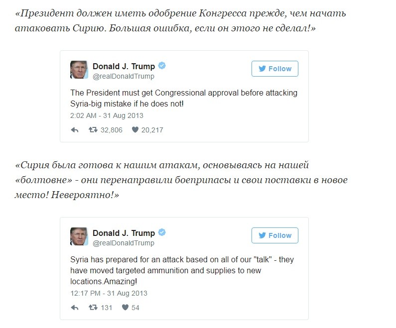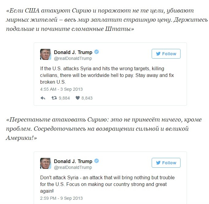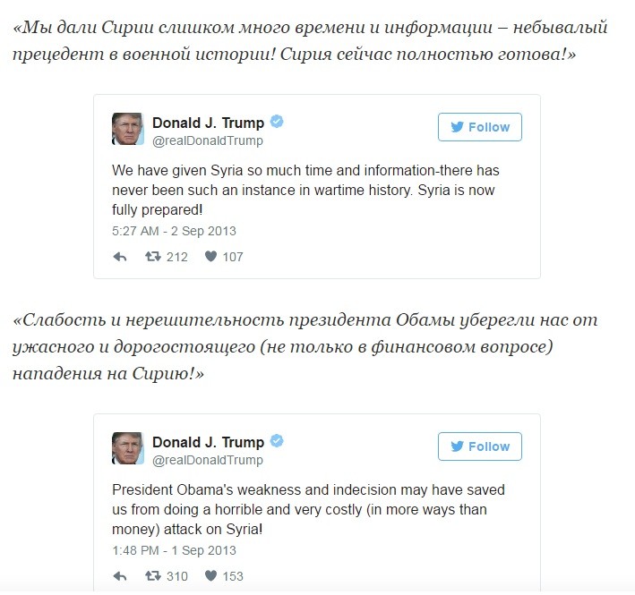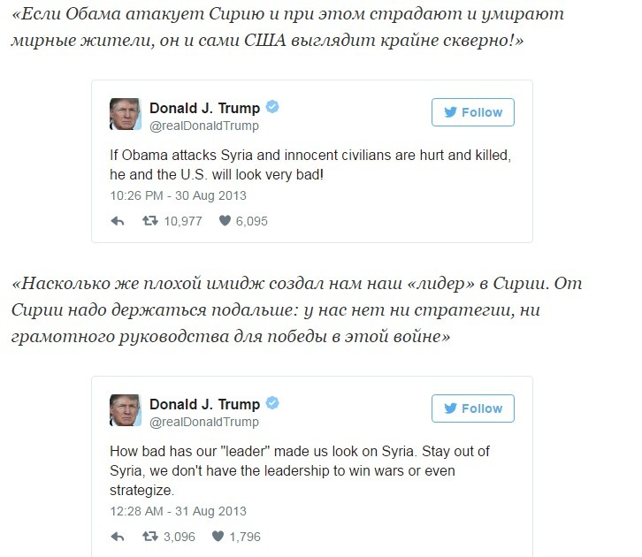 Трамп, не обременённый технологическим кретинизмом, спамил в Твиттер обвинения в адрес Обамы за провальную внешнюю и внутреннюю политику. Далее будут его твиты из далёкого 2013 года, которые полностью перечёркивают его текущую деятельность президента и ставят, в связи со вчерашней атакой на авиабазу, вопрос: «А чем ТЫ лучше?»