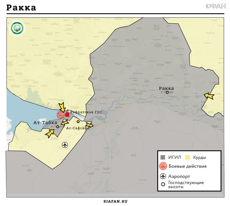 Бойцы Демократических сил Сирии продолжают штурм стратегического города Ат-Табка, расположенного в западных предместьях Ракки. С тяжелыми боями курдам удалось войти в город и выбить террористов ИГ из квартала Исаа. В данный момент продолжаются столкновения в соседнем районе. Артиллерийские отряды SDF тем временем ведут активные боевые действия на западной окраине Ат-Табки, пытаясь войти в город и с этого направления. ВВС коалиции провели бомбардировки в поддержку масштабного наступления курдов. Самолеты сбросили бомбы по позициям ИГИЛ в районах Исаа и Искандирия. Таким образом, бойцы демократической армии продолжают развивать преимущество. Противостояние в этом регионе становится пока только интенсивнее. Курдские силы наступают на позиции ИГ в рамках антитеррористической кампании «Гнев Евфрата» под командованием Соединенных Штатов.