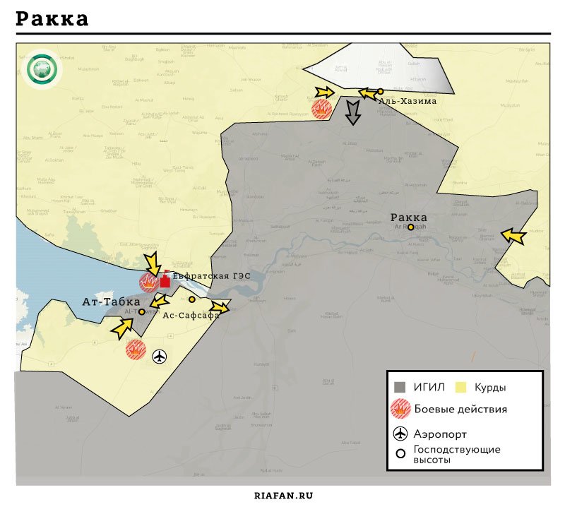 В западной части региона курдские отряды при поддержке спецназа международной коалиции штурмуют город Ат-Табка. Местные источники сообщают, что под контролем SDF находится уже 60% территории населенного пункта, однако официального подтверждения данной информации не поступало. По данным активистов, у позиций SDF в квартале Александрия взорвался заминированный автомобиль со смертником за рулем. Данных о пострадавших не поступало.