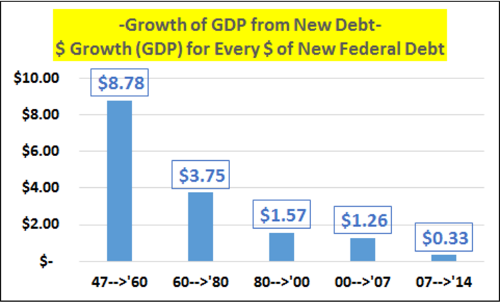 На диаграмме выше показано на сколько долларов растет ВВП при росте долга на 1 доллар. В 50-х 1 дополнительный доллар долга давал рост ВВП 9 долларов, сейчас 1 доллар нового долга даёт рост ВВП 33 цента.