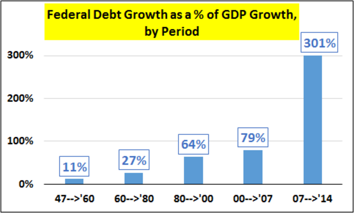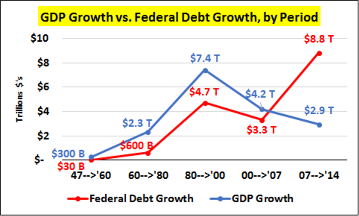 Т.е. в период с 2007 по 2014 годы рост ВВП США составил 2,9 трлн долларов, а рост долга составил 8,8 трлн долларов.