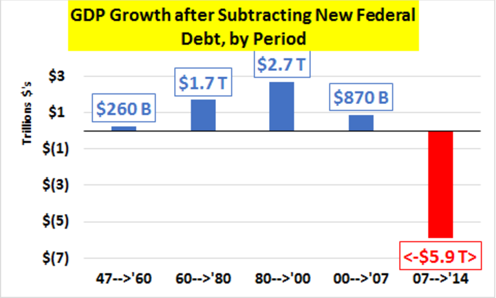 В период с 2007 по 2014 годы была именно такая ситуация. Долг вырос на 8,8 трлн, а ВВП на 2,9 трлн. Соответственно, разница 5,9 трлн долларов.