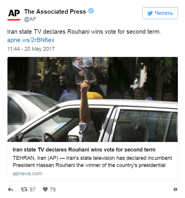 Государственное телевидение Ирана сообщило о победе действующего президента Хасана Роухани на президентских выборах, передаёт Associated Press.
