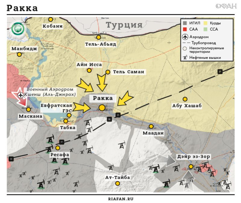 Поддерживаемые США СДС продолжили дальнейшее окружение оплота ИГИЛ – города Ракка. Отряды СДС заняли 2 главных дороги восточнее и западнее Ракки и продолжили свое наступление с целью дойти с северного и западного направлений до окрестностей города. Единственная дорога из Ракки, которую контролирует ИГИЛ – это дорога на юг.