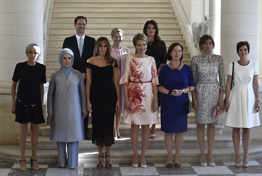 Первый ряд (слева направо): жена президента Франции Брижит Макрон, жена президента Турции Эмине Эрдоган, жена президента США Мелания Трамп, королева Бельгии Матильда, жена генсека НАТО Ингрид Шулеруд, жена президента Болгарии Десислава Радева, партнерша премьер-министра Бельгии Амели Дербодрангьен. Второй ряд (слева направо): супруг премьер-министра Люксембурга Готье Дестене, партнерша премьер-министра Словении Мойка Стропник, жена премьер-министра Исландии Тора Маргрет Бальдвинсдоттир. | Источник: РИА "Новости"