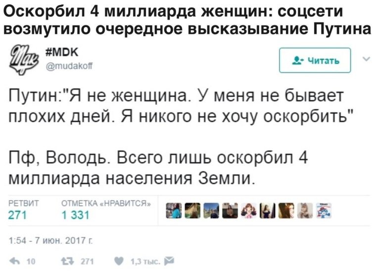 Дескать, Путин назвал всех баб истеричками и вообще, что он может знать о симптомах и причинах ПМС. В общем, осуждение и порицание свелось до банальной гинекологии с примесью плоского юмора.