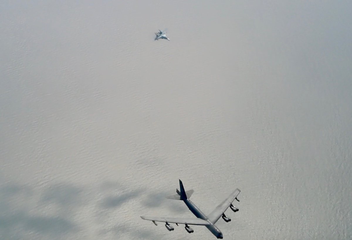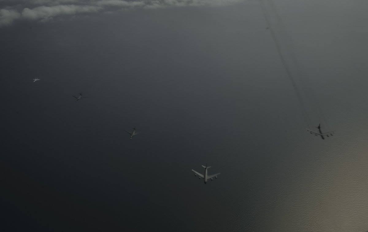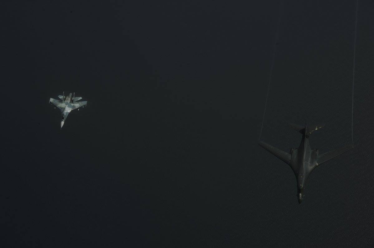 Небезынтересные фотографии перехвата 9 июня 2017 года над Балтийским морем российскими истребителями Су-27 двух американских стратегических бомбардировщиков В-52Н и двух В-1В, принимающих участие в учениях НАТО "Saber Strike" и BALTOPS. Самолеты В-52Н в ходе учений привлекались для имитации минных постановок. Снимки сделаны с борта самолета-заправщика Boeing KC-135R ВВС США.