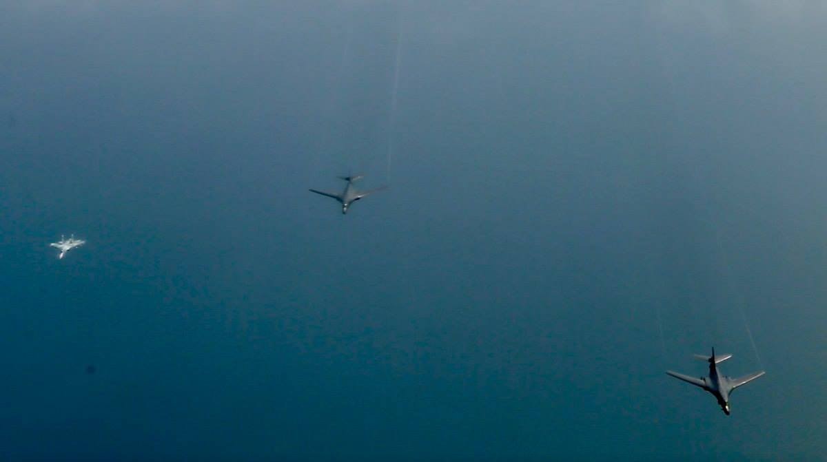 Перехват над Балтийским морем российскими истребителями Су-27 американских стратегических бомбардировщиков В-52Н и В-1В, принимающих участие в учениях НАТО "Saber Strike" и BALTOPS. Снимок сделан с борта самолета-заправщика Boeing KC-135R ВВС США. 09.06.2017 (с) ВВС США