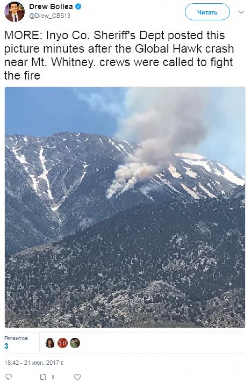 Сообщение о том, что российской ракетой был сбит американский летательный аппарат появились еще до полуночи. Несколько часов Пентагон хранил гробовое молчание и никак не комментировал данное сообщение, а затем «ошарашил мир», что точно такой же беспилотный самолет ВВС США разбился высоко в горах в Калифорнии и даже приложили к этому фотографию.