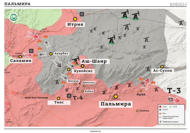 Между тем, сирийская армия и ее союзники продолжили продвижение на территорию террористов ИГИЛ в пригороде Пальмиры и вдоль границы с Ираком. Напряженные бои прошли в районе возле месторождения Арак, в то время как другая группа правительственных сил продолжила бросок в направлении на насосную станцию Т2.