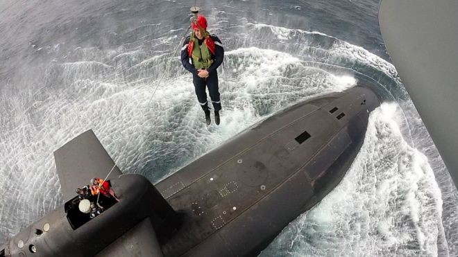 На АПЛ "Ле Террибль", находившейся в 300 км от побережья Бретани, Макрона опустили с вертолета. Позже французский президент опубликовал в соцсетях фотографию спуска.