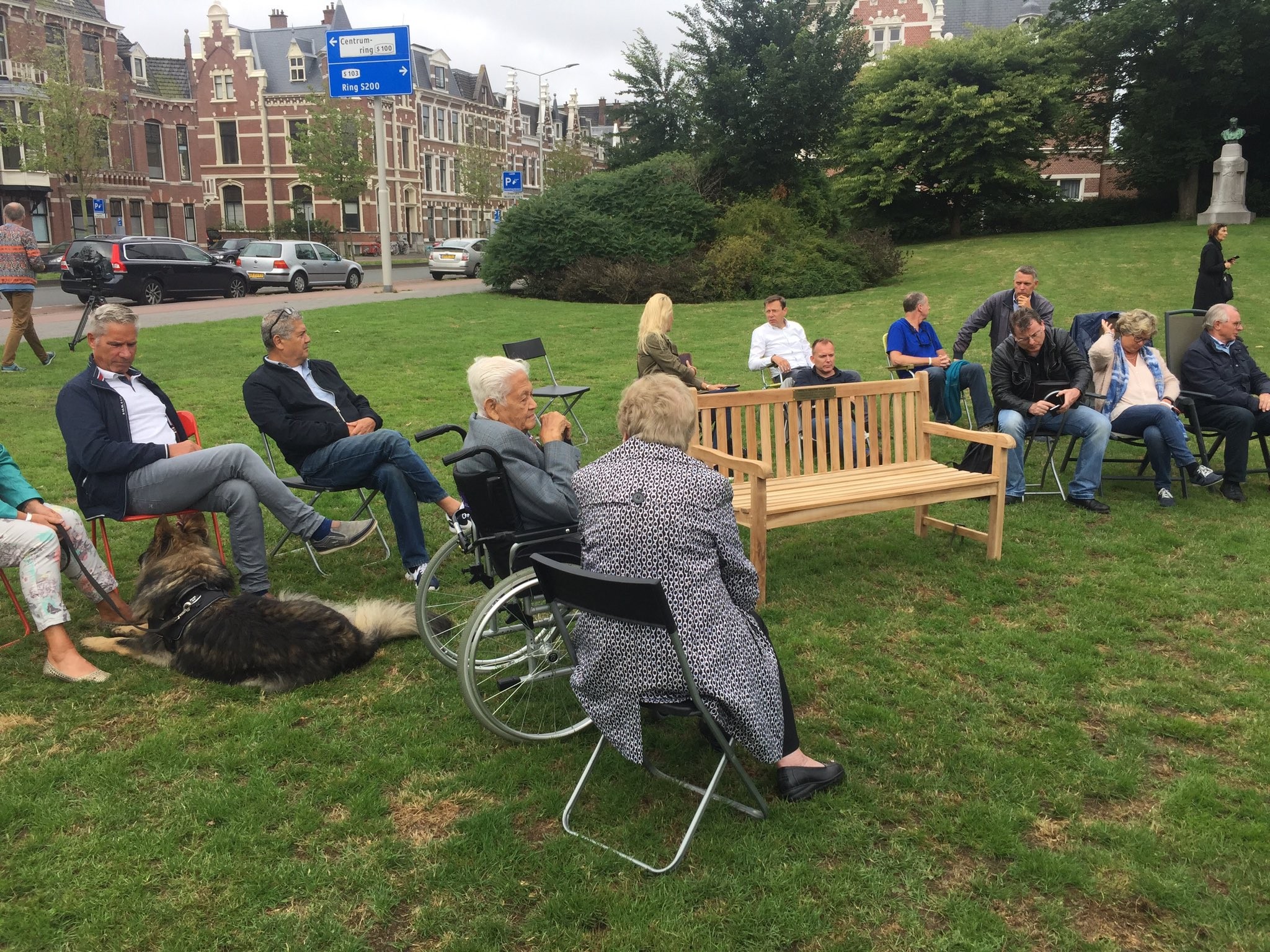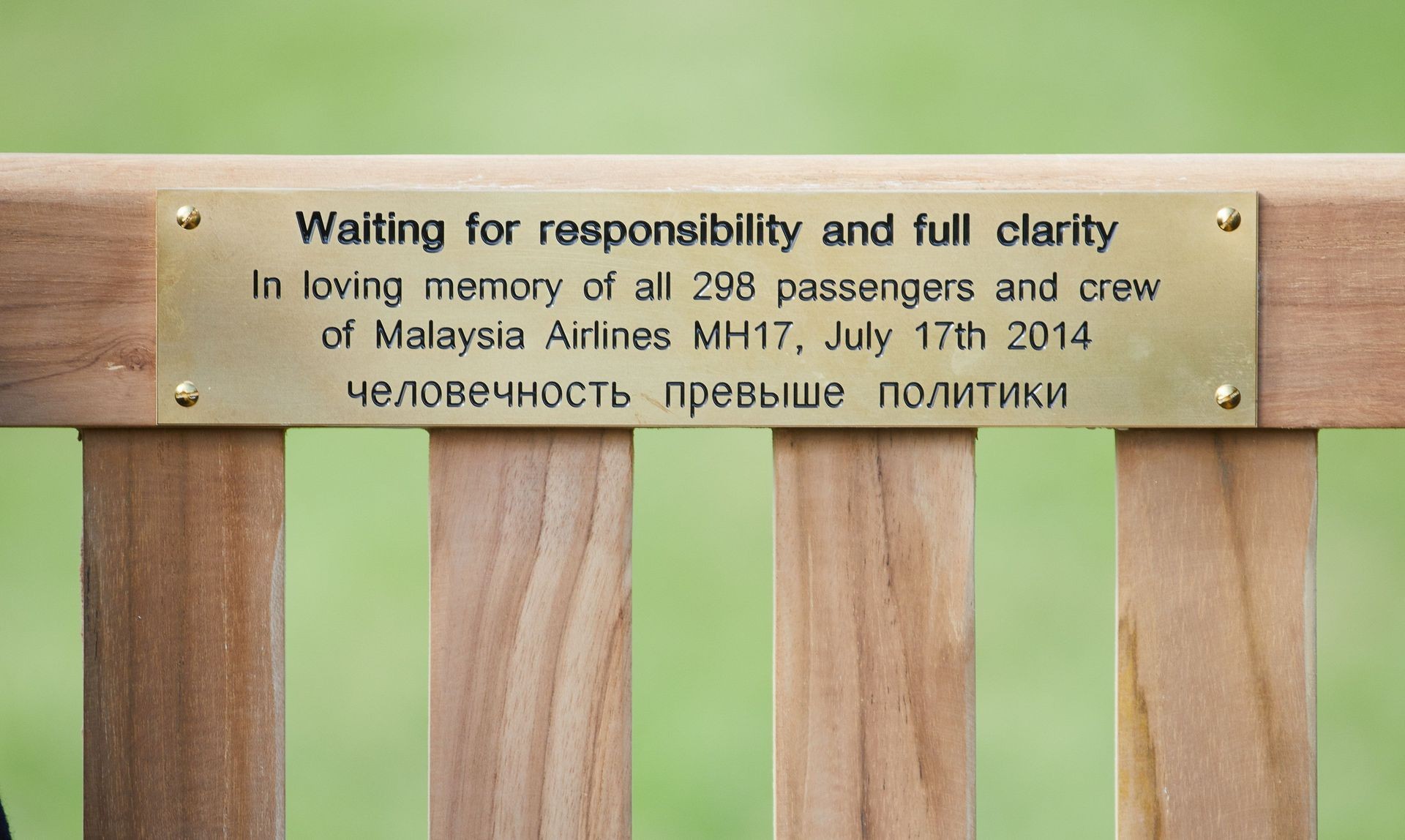 15 демонстрантов разместили на лужайке перед российским посольством скамейку с прикрепленной к ней табличкой. На табличке две надписи на английском и русском: «Ожидаем ответственности и полного расследования» и «Человечность превыше политики» соответственно.