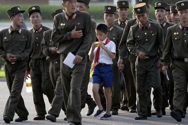 Школьник среди солдат в Пхеньяне, Северная Корея