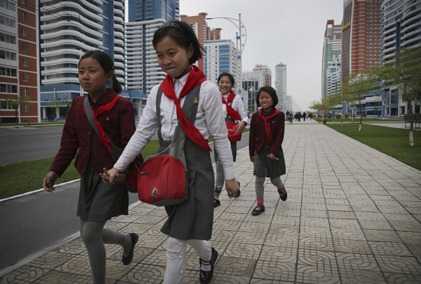 Школьницы во время прогулки в Пхеньяне, Северная Корея