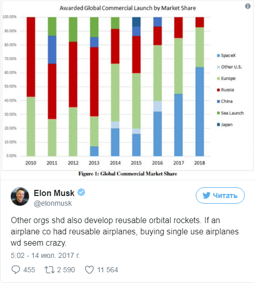 В Вашингтоне, несмотря на сильное лобби в администрации Дональда Трампа Boeing, Lockheed Martin и других аэрокосмических компаний, прекрасно понимают сложившуюся ситуацию. «До появления SpaceX с ракетой-носителем Falcon 9 рынок запусков коммерческих космических аппаратов фактически принадлежал Франции и России: ни одна американская компания не отправила ни одну коммерческую миссию на геопереходную орбиту с 2009 года», — отметил недавно старший вице-президент SpaceX Тим Хьюз на слушаниях в подкомитете сената США.