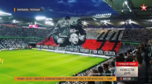 Болельщики польского клуба развернули по центру трибуны огромный баннер, на котором изображен немецкий солдат, приставивший пистолет к голове польского ребенка. Так они почтили память людей, расстрелянных бандеровцами и фашистами 1 августа 1944 года.