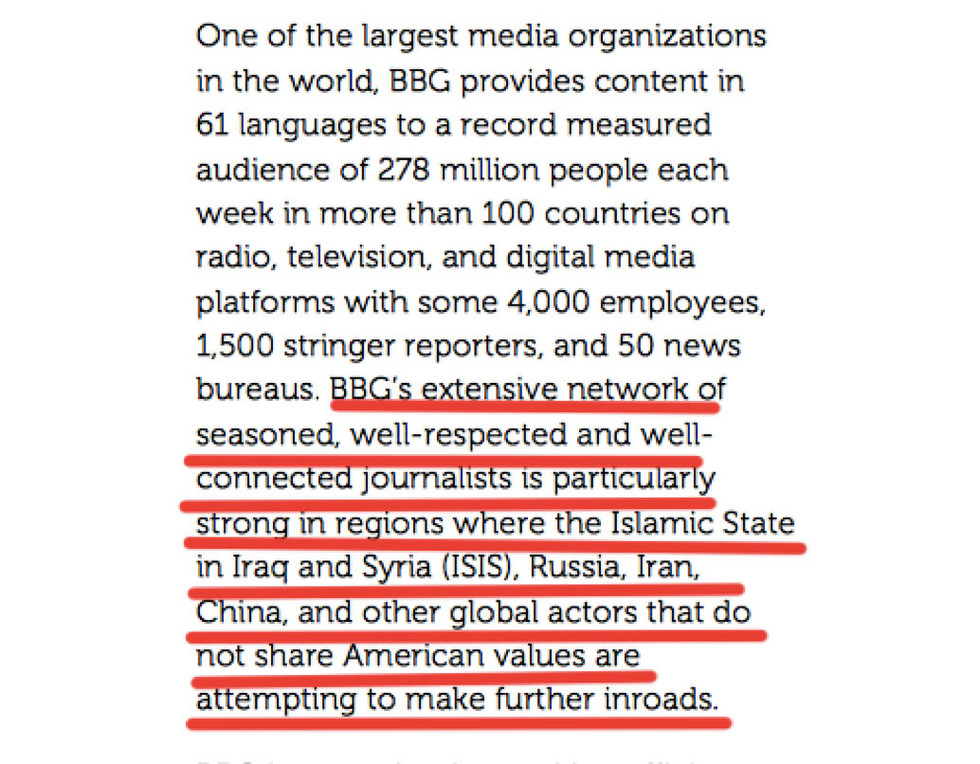В своём прошении BBG отмечает, что её хорошо организованная сеть служит распространению американских ценностей, которые не разделяются ИГИЛ*, Россией, Ираном и Китаем. Таким образом, BBG напрочь стирает моральные границы между суверенными государствами и террористической организацией, пусть и принявшей институционализированную форму.