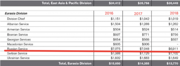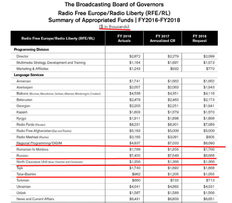 В опубликованном в мае 2017-го бюджетном прошении Совета управляющих вещанием — американской правительственной организации, определяющей информационную политику США, а также финансирующей такие рупоры американской пропаганды, как "Голос Америки" и "Радио Свобода" — средства, выделяемые на производство программ для теле- и радиослушателей в России, разделены отдельно на российские программы "Голоса Америки", русскоязычный, северокавказский и татарско-башкирский сервисы "Радио Свобода", а также службу по мониторингу и работе с российскими социальными сетями DIGIM, запущенную RFE/RL.
