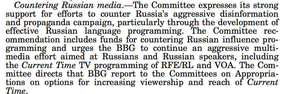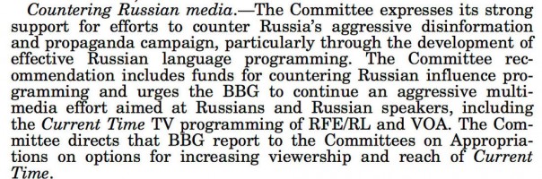 — Борьба с российскими СМИ. Комитет выражает решительную поддержку усилиям по противодействию агрессивной дезинформации и пропаганде России, в частности, за счёт разработки эффективного вещания на русском языке. Рекомендация комитета включает в себя средства, предоставляемые для программ по противодействию российскому влиянию, и настоятельно призывает BBG продолжить агрессивное мультимедийное давление, направленное на русских в целом и русских спикеров в частности, в том числе на ТВ-программы RFE / RL и VOA "Настоящее время". Комитет направляет отчёт BBG в Комитет по ассигнованиям для разработки вариантов расширения аудитории "Настоящего времени".