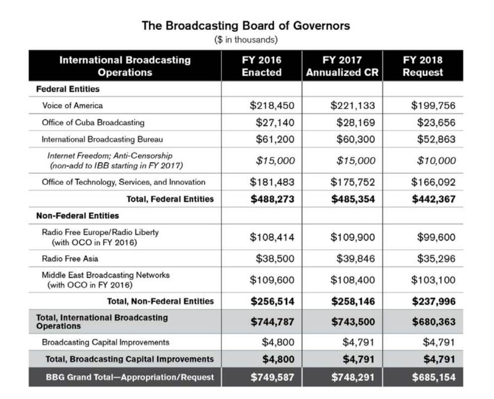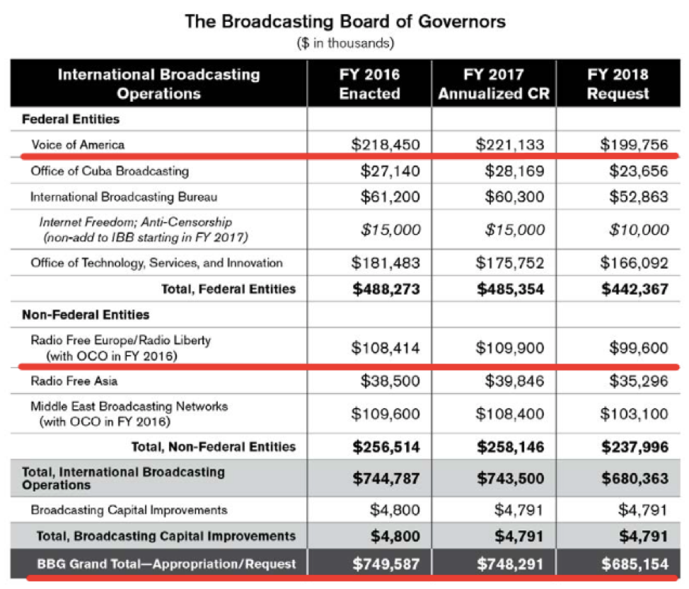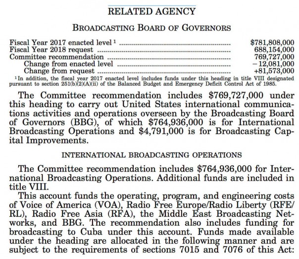Отметим, что комитет затребовал на 2018 год на 81,6 миллиона больше, чем просило само BBG. Так, в частности, предполагается увеличить бюджет "Голоса Америки" на 33 миллиона (от того, что запросил сам BBG) и на 24 миллиона Radio Free Europe / Radio Liberty ("Радио Свобода"/ "Свободная Европа"), вещающее непосредственно на русскоязычное пространство. При этом комитет выразил решительную поддержку усилиям по противодействию "агрессивной дезинформации и пропаганде России", в частности, за счёт разработки эффективного вещания на русском языке.